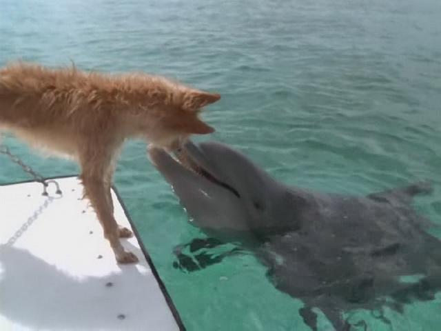 Дельфин и собака. Необычный поцелуй (ВИДЕО)