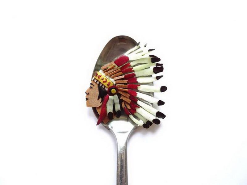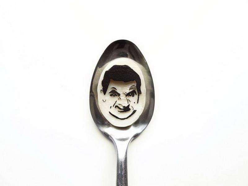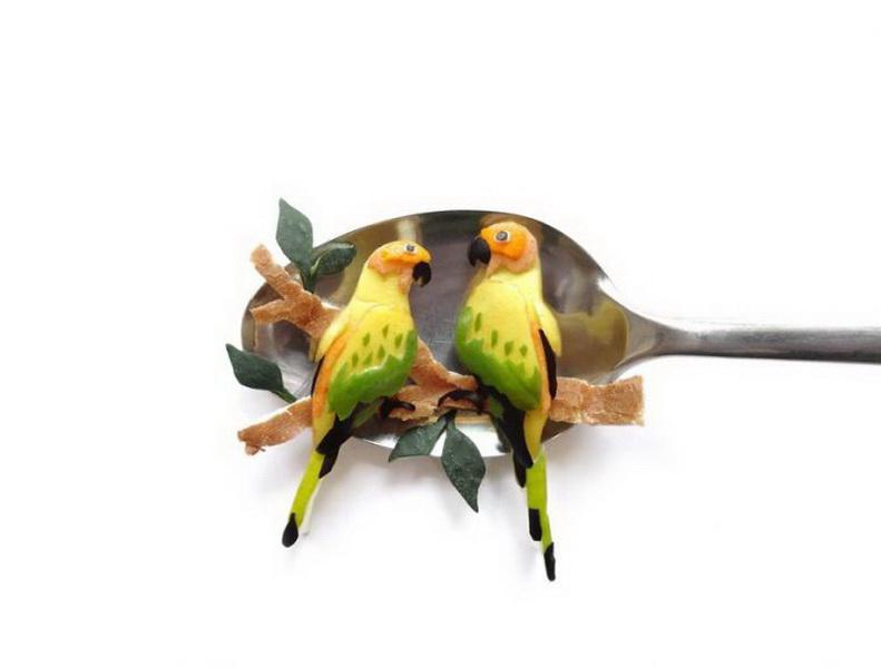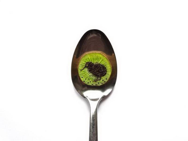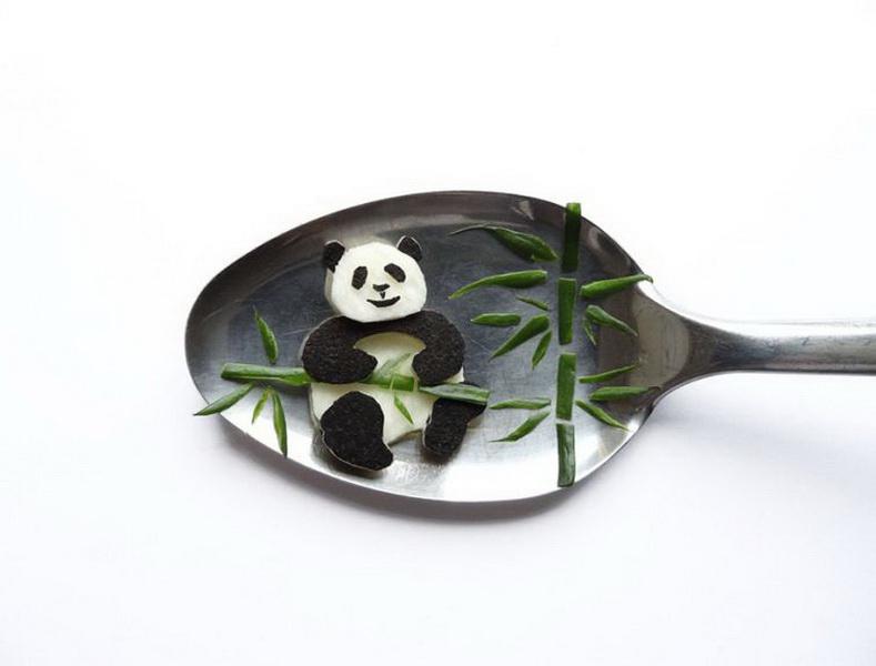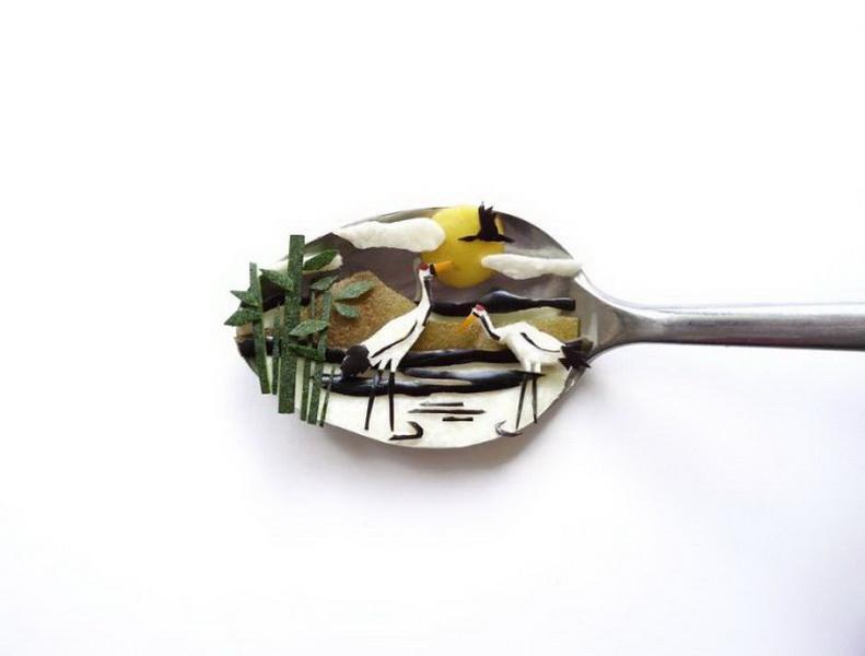 Помимо картин на ложках, художница любит создавать съедобные картины, сделанные из подручных продуктов, но вместо тарелки в качестве холста использует столовые ложки, в которых девушка и размещает свой съедобный арт.