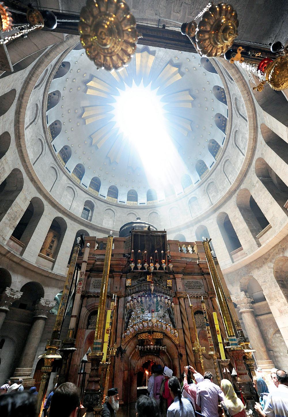 Храм, построенный на месте, где, согласно христианскому преданию, был распят, погребен и воскрес Иисус. Сейчас храм разделен между шестью конфессиями христианской церкви: православной, католической, армянской, коптской, сирийской и эфиопской. Однако во избежание конфликтов между верующими ключи от него с конца XII века хранятся в арабско-мусульманской семье, а право отпирать и запирать двери принадлежит другой мусульманской династии (ключи все это время передаются в семьях от отца к сыну). В храме, напротив входа в пещеру Гроба Господня, примерно с IV века обозначили Пуп земли — символический христианский центр мира, место спасения человеческого рода. Чтобы показать его точное местоположение, здесь и сейчас ставят невысокую мраморную чашу с шаром внутри, на котором начертан крест. Чаша довольно легкая, и ее приковывают цепью, чтобы туристы и паломники не смещали или не уносили Пуп земли