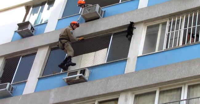 Поскольку хозяев животного дома не оказалось, спасатели решили спуститься за кошкой вниз из квартиры, расположенной выше. Не правда ли, это настоящее безумство?