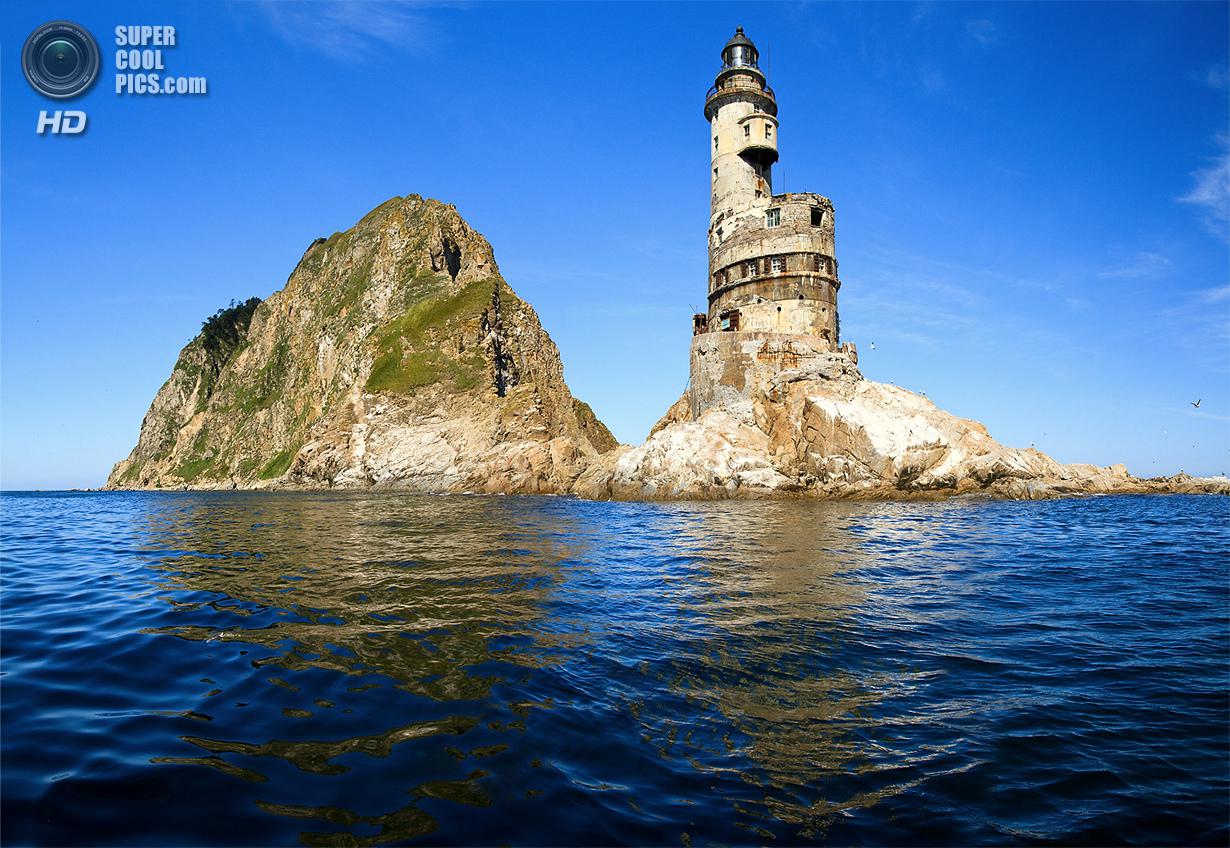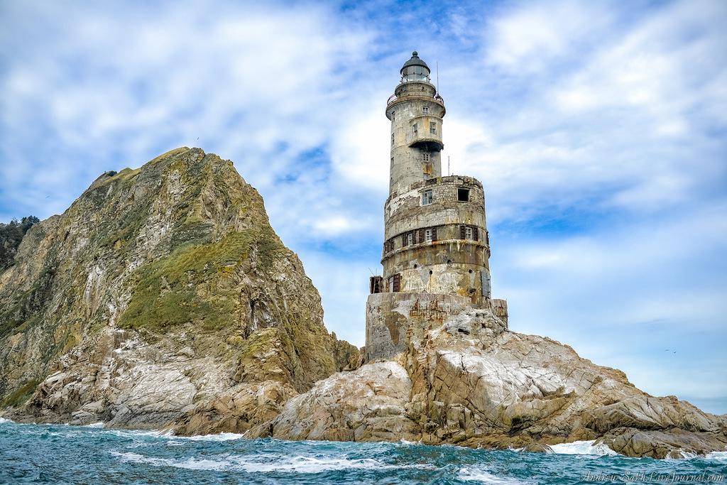 10. Россия. Анива, Сахалинская область. Маяк на скале Сивучьей. Был построен в 1939 году по проекту японского архитектора Миуры Синобу. На цокольном этаже маяка располагались дизельная и аккумуляторная; первый этаж с пристройкой занимали кухня и продовольственный склад, второй — радиорубка, аппаратная и вахтенная. На третьем, четвертом и пятом этажах были жилые комнаты, рассчитанные на 12 человек.
