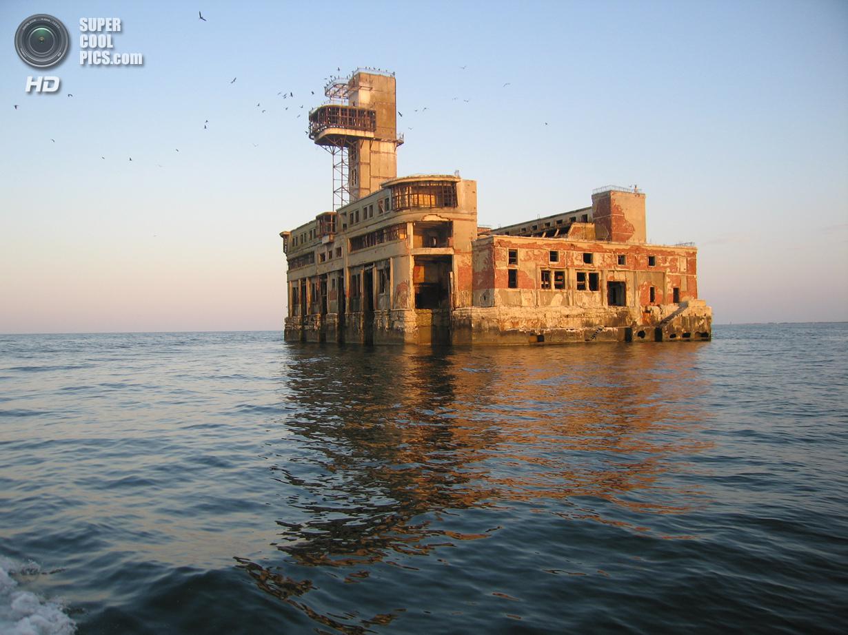 2. Россия. Каспийск, Республика Дагестан. Восьмой цех завода «Дагдизель». Испытательная станция морского оружия, сданная в эксплуатацию в 1939 году, находится на расстоянии 2,7 км от берега и давно уже не используется. К сожалению, это грандиозное сооружение прослужило заводу недолго — в апреле 1966 года оно было списано с заводского баланса. С тех пор станция стоит в одиночестве, напоминая древнее морское чудище.