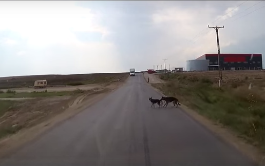 Это видео снял водитель грузовика. Сначала он просто снимал, как едет по дороге, но неожиданно увидел на трассе двух собак. Он начал громко сигналить, чтобы заставить собак сойти с его пути, а затем даже ударил по тормозам.