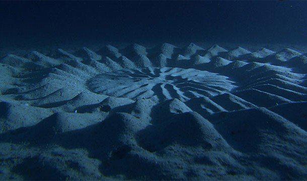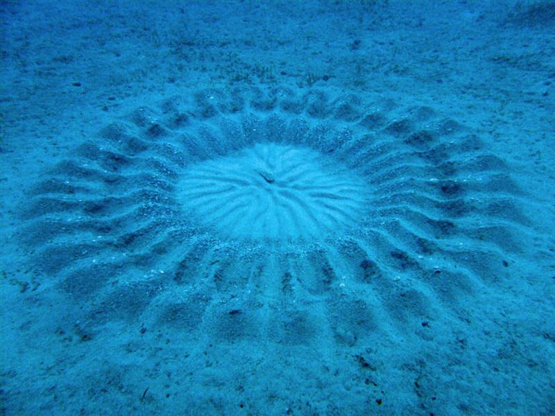 Японский фотограф Йоджи Оката во время подводных съемок обнаружил на морском дне загадочные круги. Он поспешил поделиться своей находкой, и это открытие взбудоражило научный мир. Разгадка таинственных кругов была неожиданной. Оказалось, что такую красоту создает рыба фугу! Самцы старательно «рисуют» причудливые круги на песчаном дне, привлекая таким образом самок. Чем четче «рисунок» и глубже бороздки таких орнаментов, тем желаннее автор такой работы для особей противоположного пола. Кроме эстетической красоты, такие круги выполняют еще и очень важную функцию. Процесс спаривания рыб происходит как раз в этом круге, и бороздки надежно удерживают икру на одном месте, не давая течению ее унести.