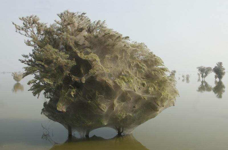 Просто-таки сказочную картину можно было наблюдать как-то в Пакистане, где деревья оказались настолько плотно обмотаны паутиной, что стали похожи на гигантскую сахарную вату. Это произошло из-за масштабного наводнения, которое вынудило множество пауков искать спасение на деревьях. В результате концентрация этих членистоногих стала настолько большой, что листья буквально скрылись под паутиной. Местные жители отмечают, что благодаря этому явлению резко сократилось количество комаров, поскольку им было негде приземлиться, кроме как на деревья с пауками.