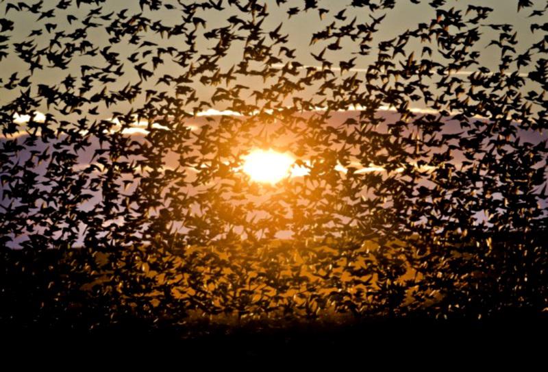 Огромные стаи скворцов, возвращаясь домой из теплых краев, пролетают над территорией Дании. Они собираются в громадные скопления, которые выглядят живыми причудливыми фигурами. Иногда скворцов так много, что они закрывают собой светило. Это явление получило поэтическое название «черное солнце Дании».