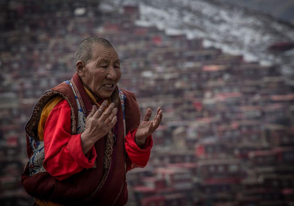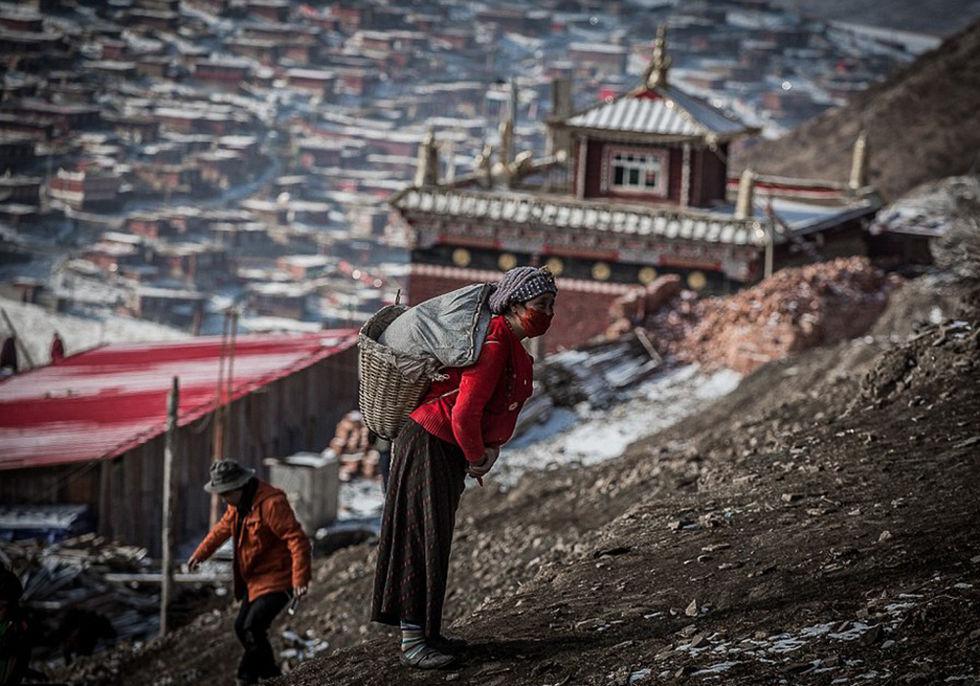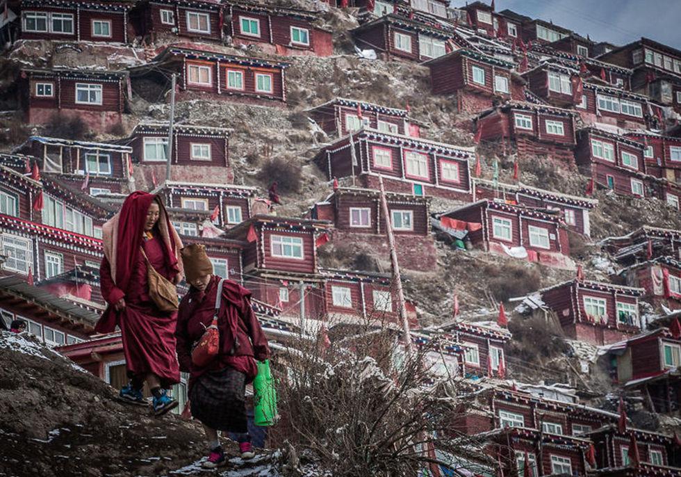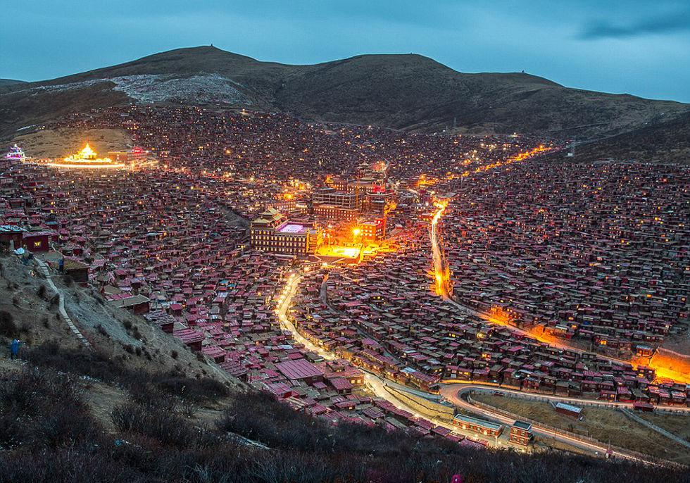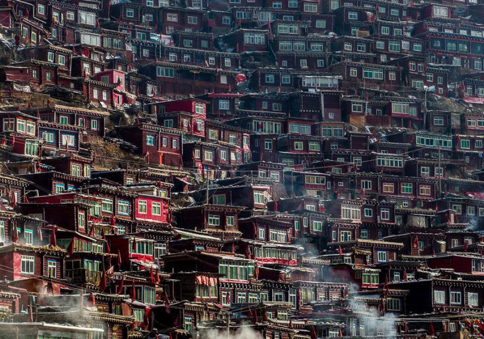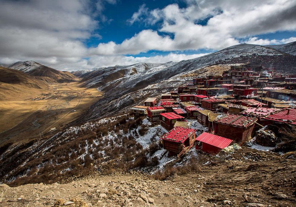 Массивные горные склоны, плотно застроенные домами, множество людей в красных одеждах, величественные храмы-— так выглядит Ларунг Гар, крупнейший в мире институт тибетского буддизма.