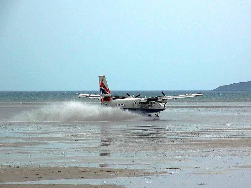Далее перенесемся из французских Альп на побережье Шотландии. Гордые люди в килтах с острова Барра – самом крупном из островов архипелага Внешние Гебриды - решили не заморачиваться и стали сажать самолеты прямо… в море. Да-да, аэропорт расположен на берегу широкой бухты Трай Мор (Traigh Mhòr) в северной части острова. Кстати, он имеет целых три(!) ВПП, концы которых обозначены деревянными заборчиками. Единственное, что может нарушить работу аэропорта – прилив. Но тут уж ничего не поделаешь – придется ждать отлива.