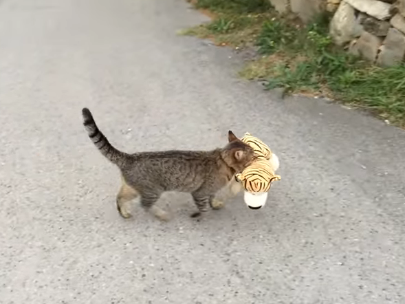По словам автора ролика, кот стащил тигра с участка его соседей. "Игрушка очень большая, поэтому ему пришлось сделать две попытки. Со второго раза у него получилось", — с гордостью сообщил он в комментариях к видеоролику.