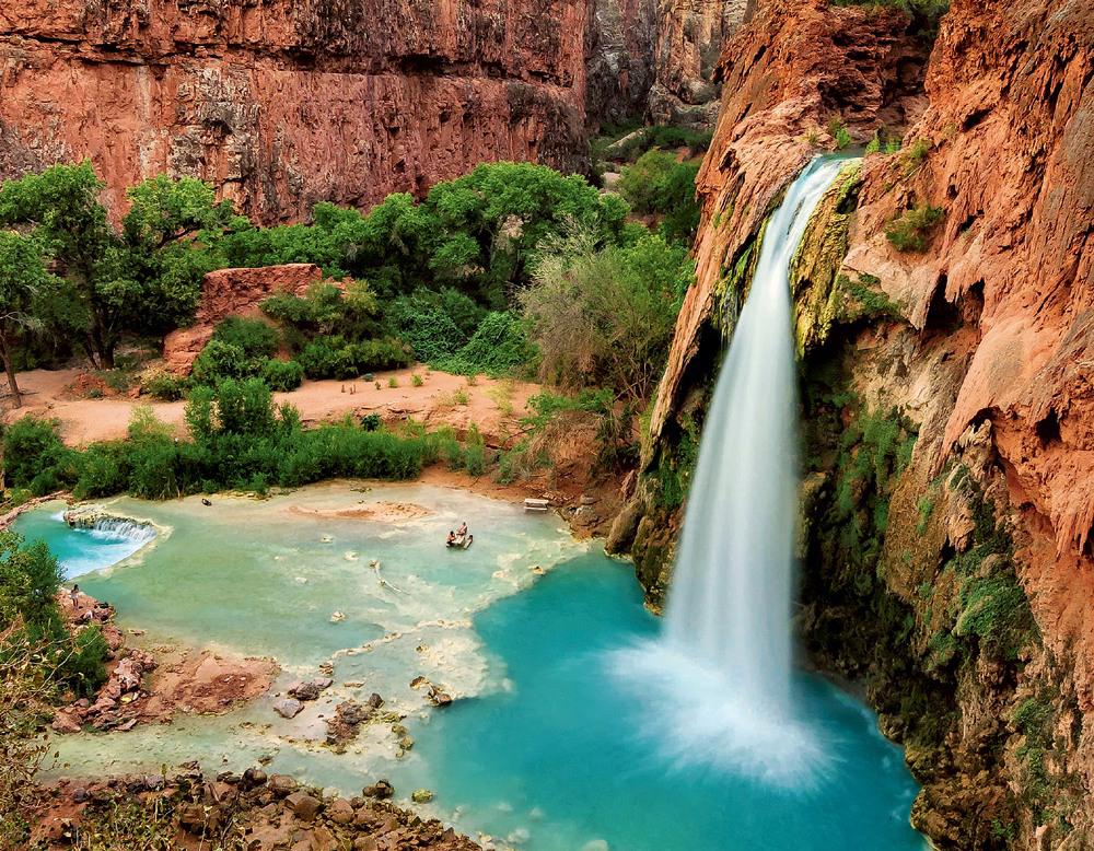 Путь к водопадам и питаемым ими озерам, расположенным между 100-метровых скал, долог и труден. Они находятся в нижней части Большого каньона, в резервации индейцев хавасупай, что значит «люди сине-зеленых вод». Температура этих вод весь год примерно 22 градуса. Но получить к ним доступ можно только с разрешения индейцев, которое надо оформлять за 6 месяцев. Туризм — основной источник дохода племени.