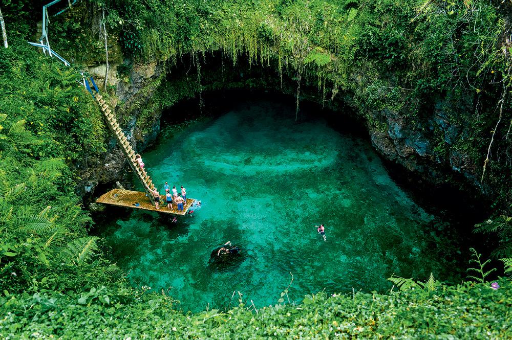 Большая голубая дыра находится в 30 метрах от берега океана среди густой тропической растительности. Она образовалась в результате обвала земли из-за вулканической активности на острове. Для спуска к воде сооружена лестница. Дыра То-Суа сообщается с Тихим океаном через подводные каналы и туннели. Уровень воды в ней зависит от приливов и отливов.