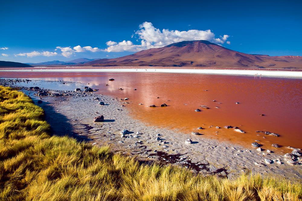 Солончаковое озеро экзотического красно-бурого цвета находится в Андах на высоте 4278 метров над уровнем моря и считается одним из самых красивых мест на Земле. Необычный цвет воде придают пигменты растущих в ней водорослей. Этими водорослями питаются редкие розовые фламинго Джеймса, которые тысячами гнездятся по берегам лагуны.