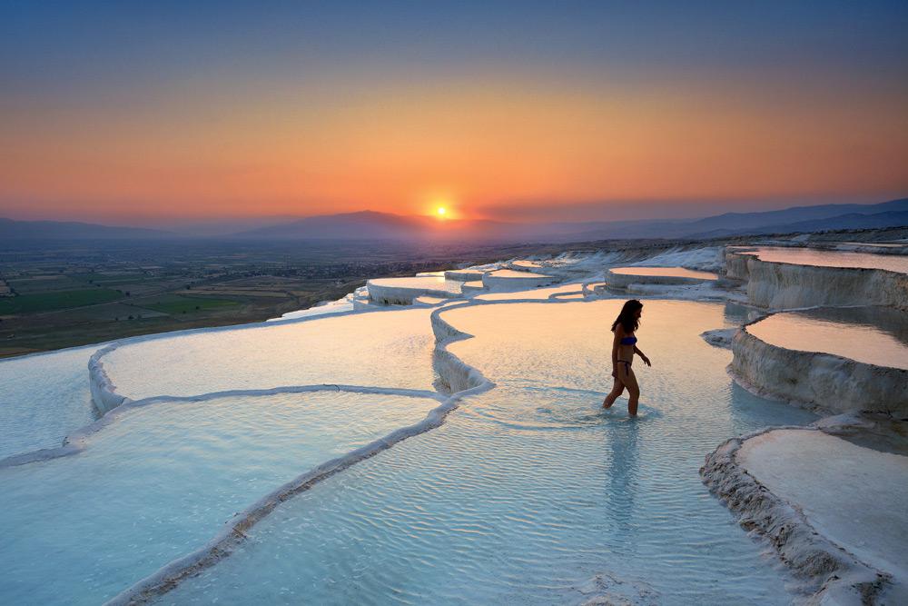 «Памуккале» в переводе с турецкого означает «хлопковый замок». И действительно, издалека гора похожа на замок. На самом деле на склонах расположены террасы водоемов со стенами из белоснежного травертина — породы, образованной солями кальция. Ими богата вода, стекающая из 17 термальных источников с вершины. Рядом с Памуккале — руины античного города Гиераполя. Оба объекта входят в Список всемирного наследия ЮНЕСКО.