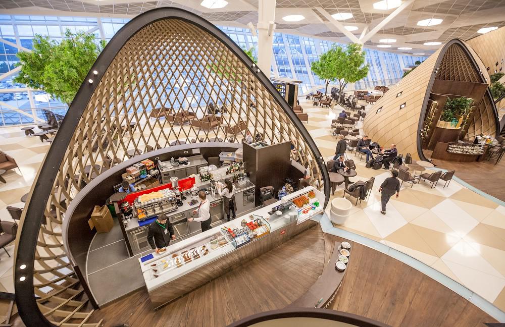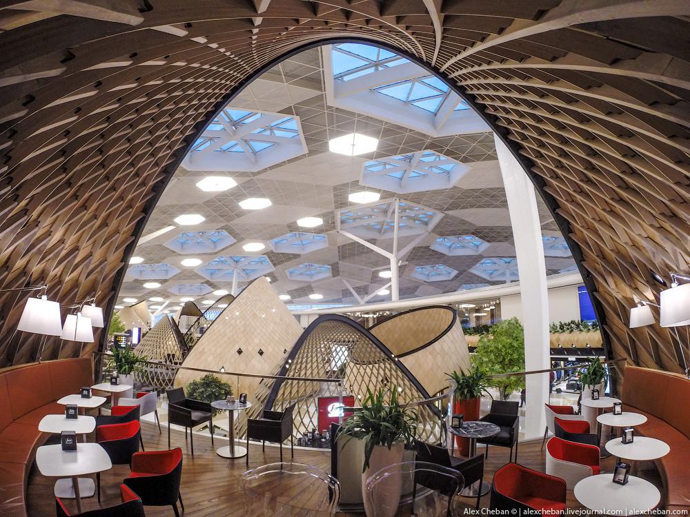 Снаружи новый терминал в Баку выглядит в духе большинства современных аэропортов: микс геометричности, футуризма и высокотехнологичных материалов — бетона, стекла и металла. Внутри комплекса – живой и необычный интерьер с деревянными элементами-коконами.