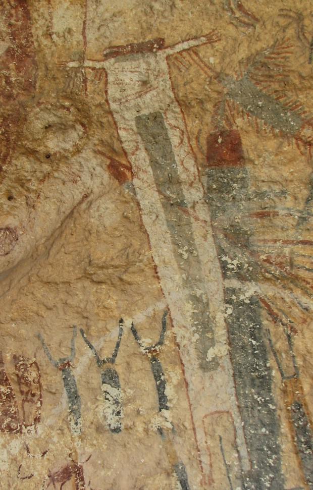 «Скалу Белого Шамана», расположенную неподалёку от реки Пекос на территории современного штата Техас, причисляют к наиболее известным и в то же время — самым таинственным памятникам той эпохи. По мнению учёных, огромный (около 7 м в длину) рисунок появился более 4 тыс лет назад и принадлежит древней культуре, о которой сейчас практически ничего не известно. Некоторые археологи уверены, что арт-объект изображает сцену боя или какого-либо боевого ритуала, также существует мнение, что художник показал момент общения древних с духами посредством мескалина, психотропного вещества, содержащегося в кактусе пейот.