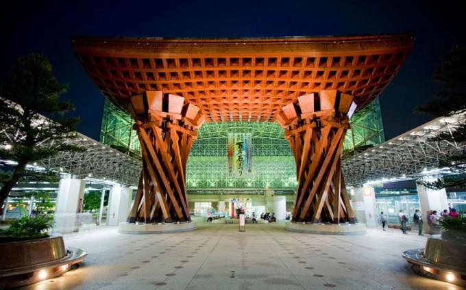 Футуристический станция Канадзава в японской провинции Исикава как бы парит в воздухе под гигантским сводом. Ворота Цудзуми, построенные в 2005 году, украшают фасад. Внутри находятся большой торговый центр и семь платформ.