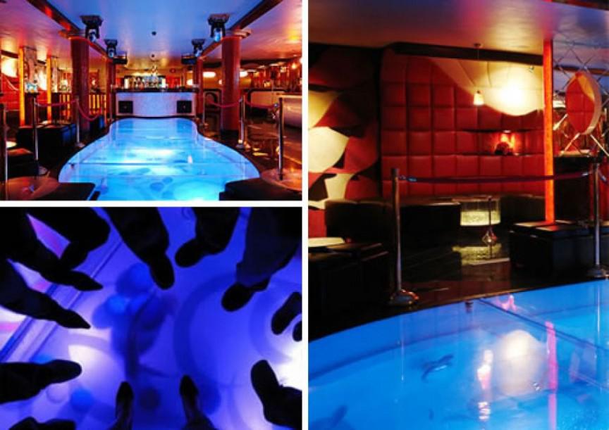 В техасском баре QUA Bottle Lounge посетителям предлагали не только напитки, но и адреналин: пол бара был аквариумом, полным акул и скатов. Бар был дорогим, но из-за интересного аттракциона посетители не иссякали. Тем не менее, из-за жалоб общества защиты животных бар закрыли.