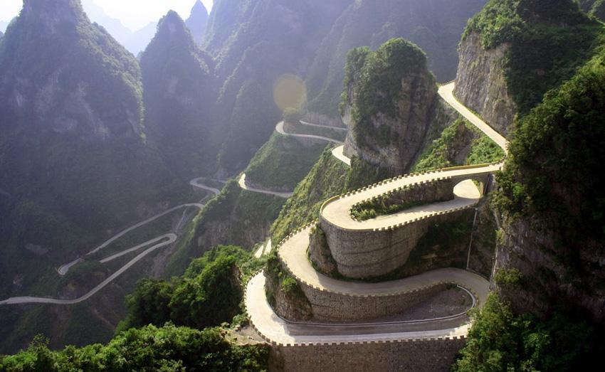 Дорога Tianmen Mountain, КитайПротяженность дороги составляет 10 км. Дорога имеет 99 крутых поворотов, а перепад высот между ее начальной и конечной точкой составляет 1000 метров.