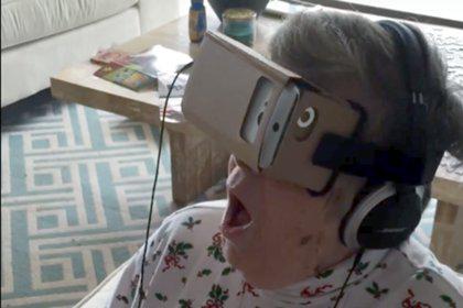 Старушка совершенно не испугалась виртуального аттракциона и пребывала в полном восторге от происходящего, чем и привлекла множество зрителей.