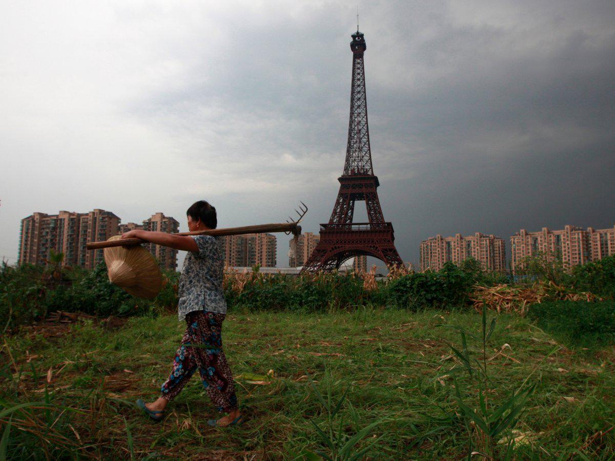 Фермер идёт по грунтовой дороге мимо копии Эйфелевой башни в Ханчжоу.