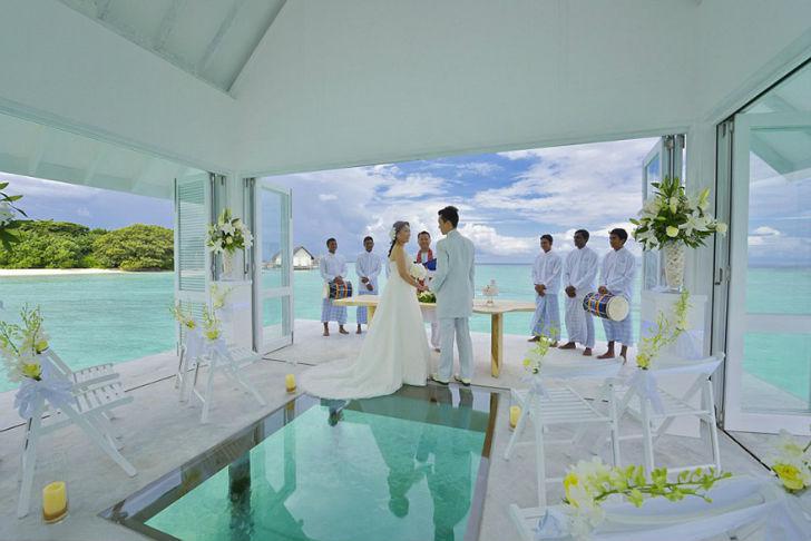 Павильон может вместить самих брачующихся и их 16 гостей, а свидетелями пары могут стать морские черепахи и экзотические рыбки, потому что пол павильона тоже прозрачный.