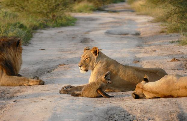 Львы просто устроили привал на месте недавних баталий. Издали даже казалось, что лисенок также является членом их прайда.