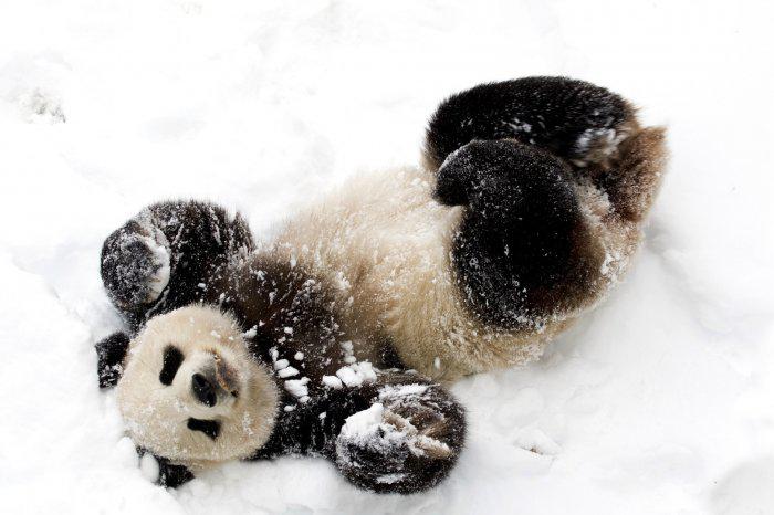 Пользователи твиттера называют панду «очаровательной» и отмечают, что «людям стоило бы поучиться у панд тому, как радоваться снегу».