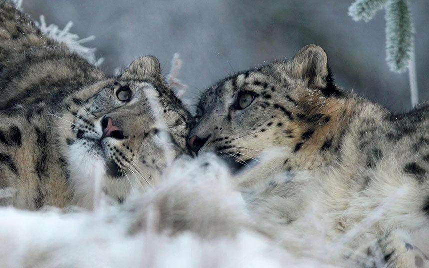 Снежные барсы в Парке дикой природы в Шотландии.