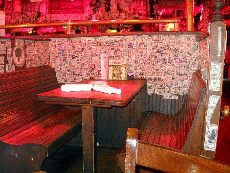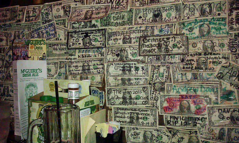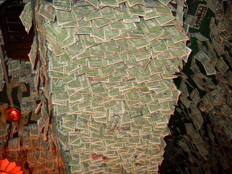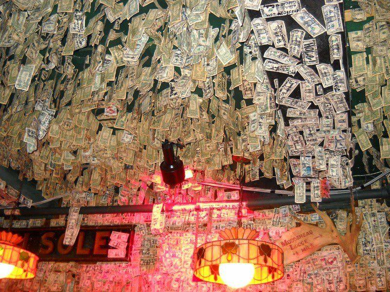 Они пишут на купюрах пожелания или известные цитаты, и прочее, прикрепляя купюру в понравившееся место. По оценкам владельцев, сейчас стены и потолок украшают купюры, общий номинал которых превышает один миллион долларов. А все началось с первого заработанного доллара, который владелец по традиции на удачу прикрепил за барной стойкой.