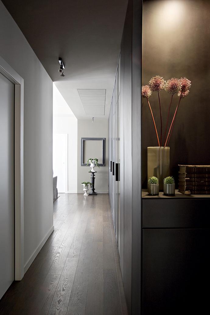 Пространству, которое увидели Паоло и Стефано, явно не хватало тепла, а сам интерьер выглядел очень разнородным. В качестве объединяющего звена, а заодно и эффектного декоративного элемента в холле, гостиной и зоне столовой установили железные панели от пола до потолка. Металл специально протравили кислотой, чтобы поверхность приобрела интересную текстуру. Благодаря этому обычный и дешевый материал стал выглядеть очень благородно и дорого. Ко всему прочему, решение украсить апартаменты такими панелями оказалось очень функциональным — в них скрыли многочисленные системы хранения. Черно-коричневый с золотыми прожилками металл определил цветовую гамму всего интерьера.