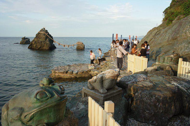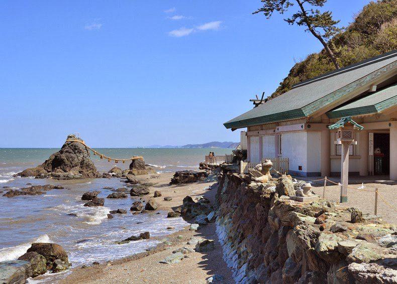 Эти два кекура, так называются отдельно стоящие в воде скалы, являются местом поклонения обитателей близлежащего храма Футами Окитама. Две скалы – два символа. Один из кекуров – это образ бога творения Идзанаги, а второй – богини творения и смерти Идзанами. Они были также супружеской парой.