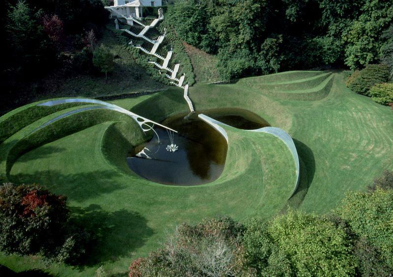 Диковинный ландшафт сада состоит из пяти областей, заполненных водоемами разнообразных геометрических форм, необычными изумрудными холмами, долинами и странными скульптурными композициями, отображающими сложные научные мысли.