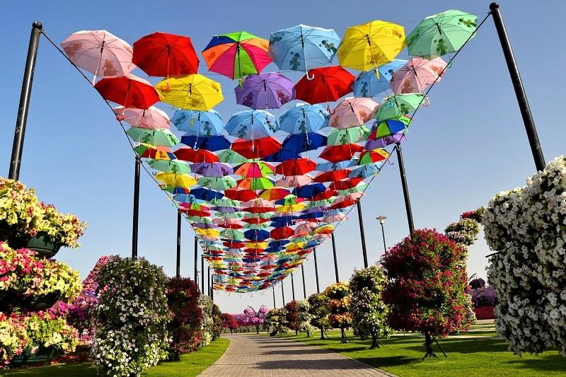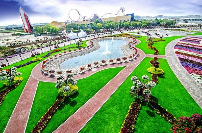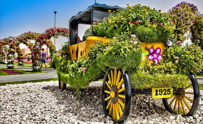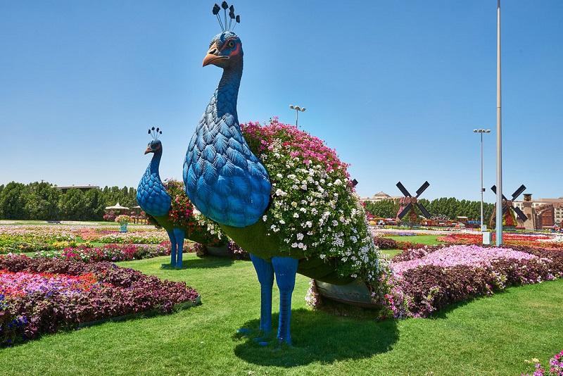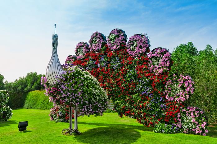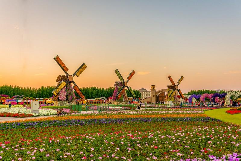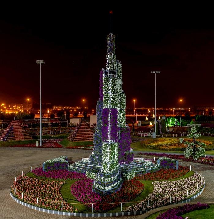 Еще одна прекрасная идея дизайнеров – международный сад. Он предлагает отправиться в увлекательное путешествие и увидеть выполненные из живых цветов скульптуры из ОАЭ и многих друг стран мира (перевернутый дом, башню Халифа, голландские мельницы, Эйфелеву башню).