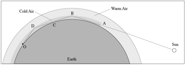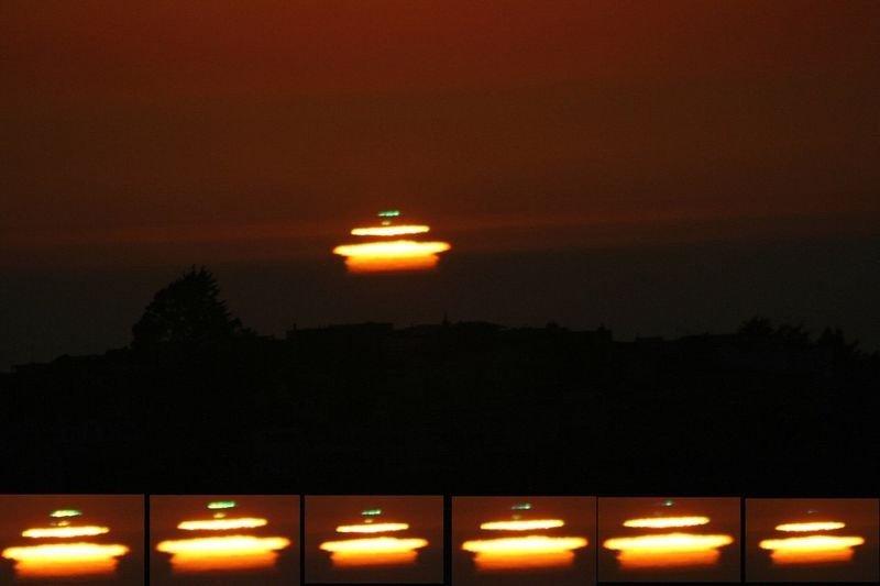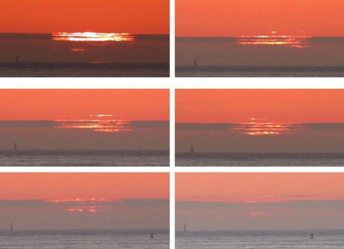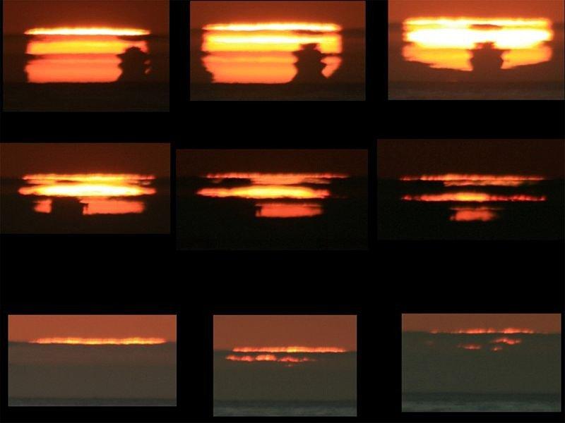 Лучи Солнца за счет инверсии в воздушных слоях отображаются словно в линзе и могут иметь форму от привычной округлой, вплоть до квадратной.