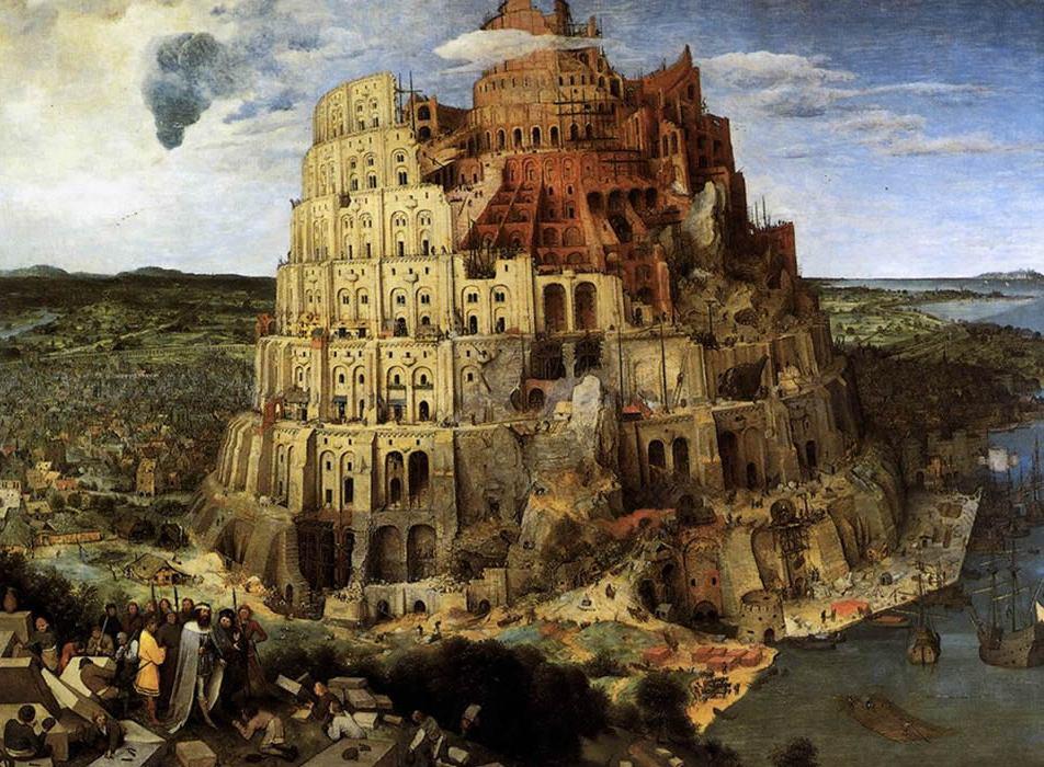 Упоминание о башне содержится во 2 главе «Ноах» книги Бытия. Согласно легенде, все древние народы общались после потопа на одном языке. Потом, чтобы заявить о себе, люди решили построить башню до небес. Но Богу эта затея не понравилась, поэтому он дал народам разные языки, после чего строители уже не смогли общаться между собой и расселились в разных уголках планеты. Так Библия обьясняет многоязычие на нашей Земле