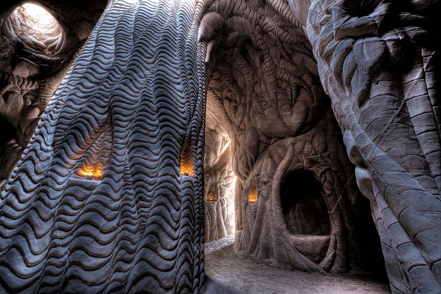 В пещерах он прорезает окна в стенах и потолках, и солнце днем заливает залы яркими лучами. Свои таинственные подземные дворцы Ра называет «первозданными святилищами», в которых человек, оставаясь наедине с собой, может почувствовать душу мира. Творит он ради собственного удовольствия и самовыражения. А пока работает, устраивает в пещере уютный уголок для себя, в котором есть все, что нужно для жизни.