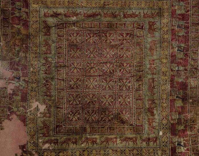 Пазырыкский ковер, возраст которого оценивается в 2500 лет, соткан симметричным двойным узлом (хордиес), иначе называемым турецким. Он был найден в могиле скифского аристократа в холодном, сухом климате гор Алтая. Когда-то он был ярко-синим с оливковыми канвами, но сейчас он малиново-бордовый, с золотисто-желтым рисунком.