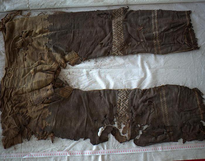 Эти шерстяные брюки были обнаружены в некрополе Янгхай возле Турфана (северо-западный Китай). Они датируются 1122-926 годами до н.э., но по-прежнему находятся в очень хорошем состоянии. Брюки украшены зигзагообразной вышивкой в районе голеней и красивым рисунком из ромбов в районе коленей.