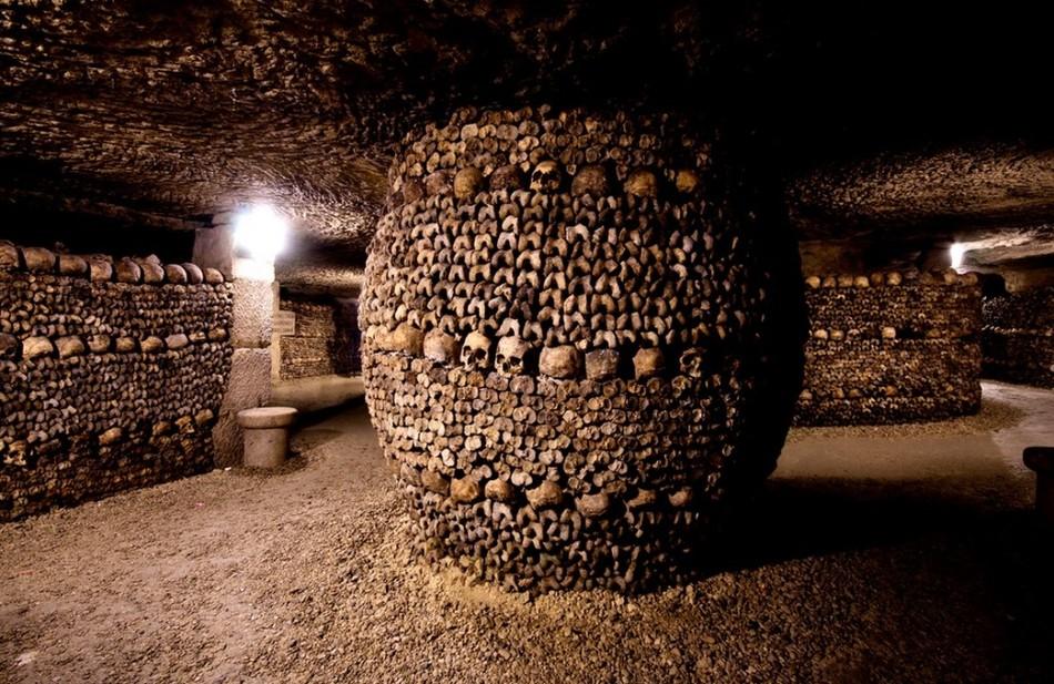 Эти подземные туннели появились во время добычи известняка для строительства парижских храмов и дворцов. В конце 18 века здесь перезахоронили останки с местных кладбищ, потому как они превратились в настоящие источники чумы и прочих смертельных инфекций. В общей сложности останки 6 миллионов тел прошли антибактериальную обработку и были использованы в качестве стен и опор.