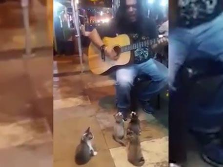 Пушистые меломаны. Четыре котенка заслушались игрой уличного музыканта (ВИДЕО)