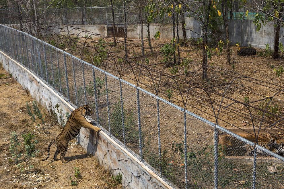 Территория, где могут гулять тигры, представляет собой небольшие пространства с довольно грязными бассейнами и высокими заборами с колючей проволокой.