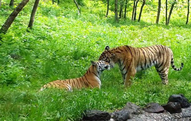 В сообщении пресс-службы сафари-парка рассказали, что тигрица первая начала проявлять знаки внимания к Амуру, перегораживала ему путь и ходила за ним хвостиком: «Тигрица весь день кружила вокруг Амура, не давая ему отдохнуть на траве». Амур принял приглашения Уссури, и теперь в их семейной жизни царит гармония.