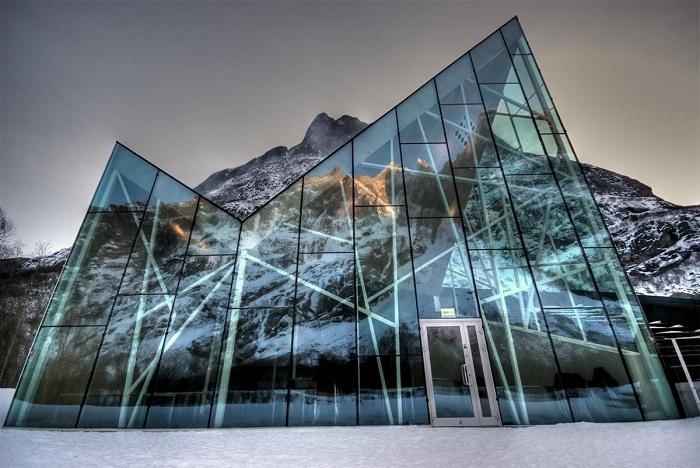 Теперь все, кто желают увидеть знаменитую каменную Стену Троллей (Trollveggen), могут сделать это с большим комфортом. Архитекторы из компании Reiulf Ramstad Architects спроектировали и построили у подножия скалы ресторанный комплекс. Фасад здания буквально вторит окружающему пейзажу, а застекленная поверхность отражает монументальную Стену Троллей.