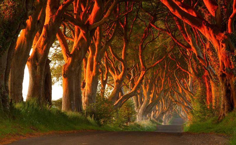 А этот лес будто сошел со страниц фантастического романа. Dark Hedges, украшающий дороги Северной Ирландии, смахивает на тоннель, ведущий прямиком в сказку. Фанаты Джорджа Мартина несомненно признают эту местность — именно здесь пробегала малышка Арья Старк в начале второго сезона.