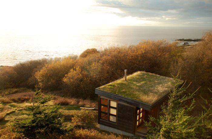 Расположенный на одном из островов Сан Хуан (штат Вашингтон, США), частный домик Eagle Point Cabin укрылся от сильных ветров в нише между небольшим холмом и зарослями. «Зеленая» крыша еще больше маскирует жилище от случайных взглядов прохожих.
