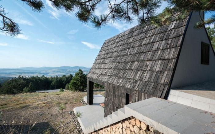 На сербском курорте Дивчибаре находится небольшой, одинокий дом. Темная часть его фасада гармонирует с сосновым лесом, а светлая – с каменистой местностью. Такая игра на контрастах стала верным решением, объединив в себя традиции и современность. Несмотря на то, что площадь дома 76 квадратных метров, он предназначен только для одного или двух людей, желающих уединиться в лесной чаще подальше от городской суеты.