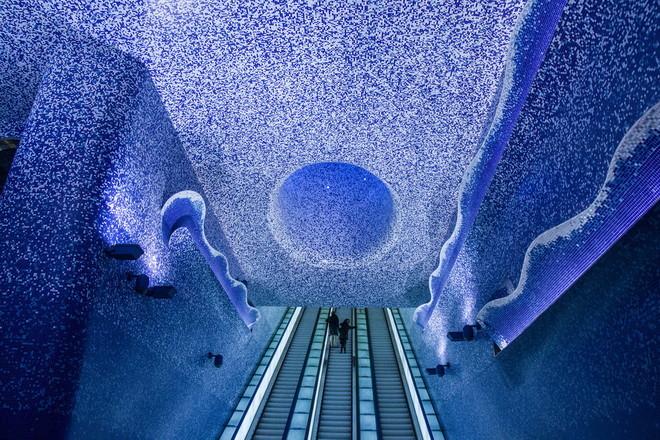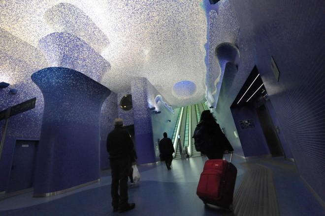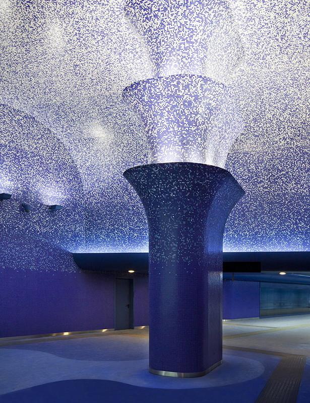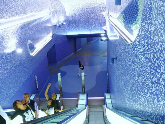 Появилась она совсем недавно – была введена в эксплуатацию в сентябре 2012 года. Спуск на 50 метров под землю к поездам вызывает ощущение то ли спуска к центру Земли, то ли, напротив, подъема к облакам, благодаря цветам, в которые оформлены стены. Но когда вы оказываетесь внизу, в длинном коридоре, отделанном голубой мозаикой, то теперь уже вас не покидает впечатление, что вы на дне моря.