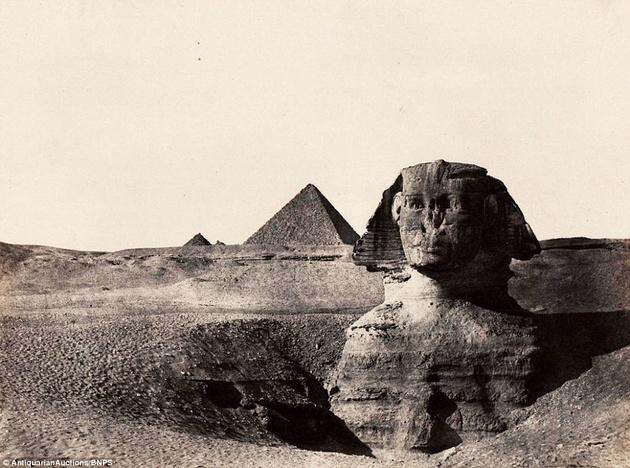 На фотографиях запечатлены архитектурные памятники Древнего Египта, в том числе пирамиды и Сфинкс. Каждый отпечаток из уникальной коллекции имеет авторскую подпись на французском языке.