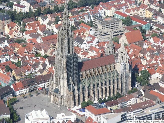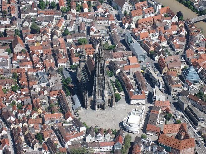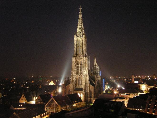 Его начали возводить в 1377 году как католический храм, и приостановили, завершив основу, в 1405-м из-за неустойчивости боковых нефов. В 1530-м, преобразовав церковь в лютеранскую, возобновили строительство, и, доведя шпиль до 100 метров, спустя 13 лет вновь заморозили стройку. Последовавшие всевозможные религиозные, политические и военные проблемы никак не давали завершить храм. Помешало даже открытие Америки, из-за чего торговые пути сместились и лишили Ульм необходимых притоков денежных капиталов, ведь он строился на народные деньги. Работы возобновились только в 1817 году, и 31 мая 1890 года многовековая стройка была завершена. Собор вознесся на 161,5 метра, став самым высоким храмом мира, далеко обогнав, в том числе, и пирамиду Хеопса.