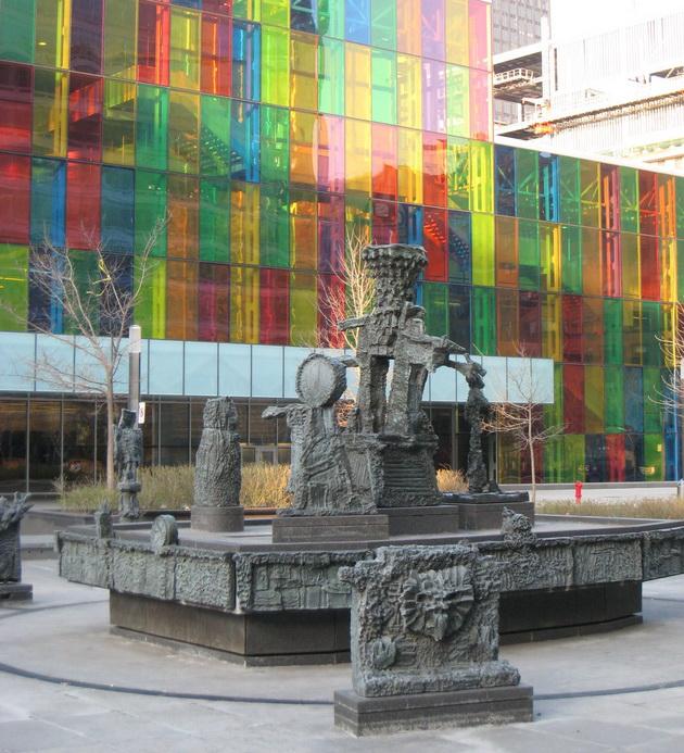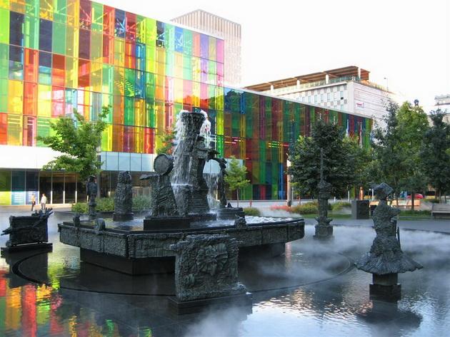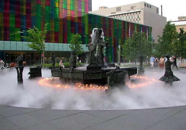 Фонтан Поединок (La Joute Fountain) – чудо кинетического искусства. Сотворил его еще в 1969 году художник и скульптор Жан-Поль Риопель. Неискушенному в хитрых трюках зрителю шоу, которое устраивает перед ним фонтан, может и правда показаться волшебным. На протяжении 32 минут каждый час с 7 утра и до 11 вечера длится представление, которое включает изначально струи воды, потом застилающий все вокруг туман, а далее кольцо огня, окружающего бронзовые скульптуры абстрактных животных и человеческих фигур.